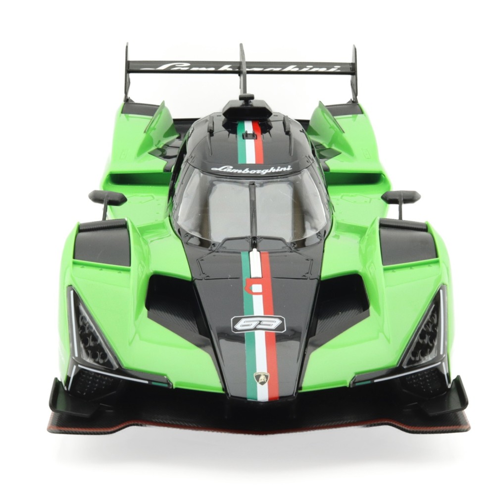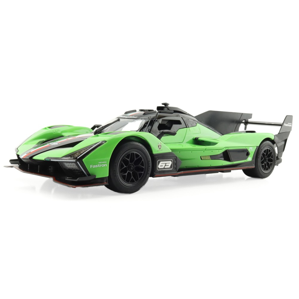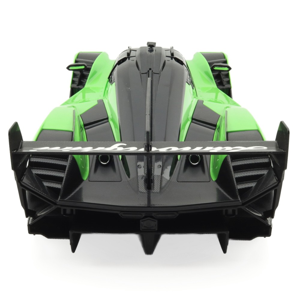 Atraktivitu modelu podtrhují funkční LED světla, která dodávají jízdě správnou atmosféru, a otevírací dveře, jež zvýrazňují pečlivé zpracování detailů. Působivé křivky karoserie, nízký profil a závodní detaily dělají z tohoto vozu nepřehlédnutelný kousek do každé sbírky. Zelená barva, typická pro závodní speciál Lamborghini, zaručí, že model vynikne na poličce i na trati.